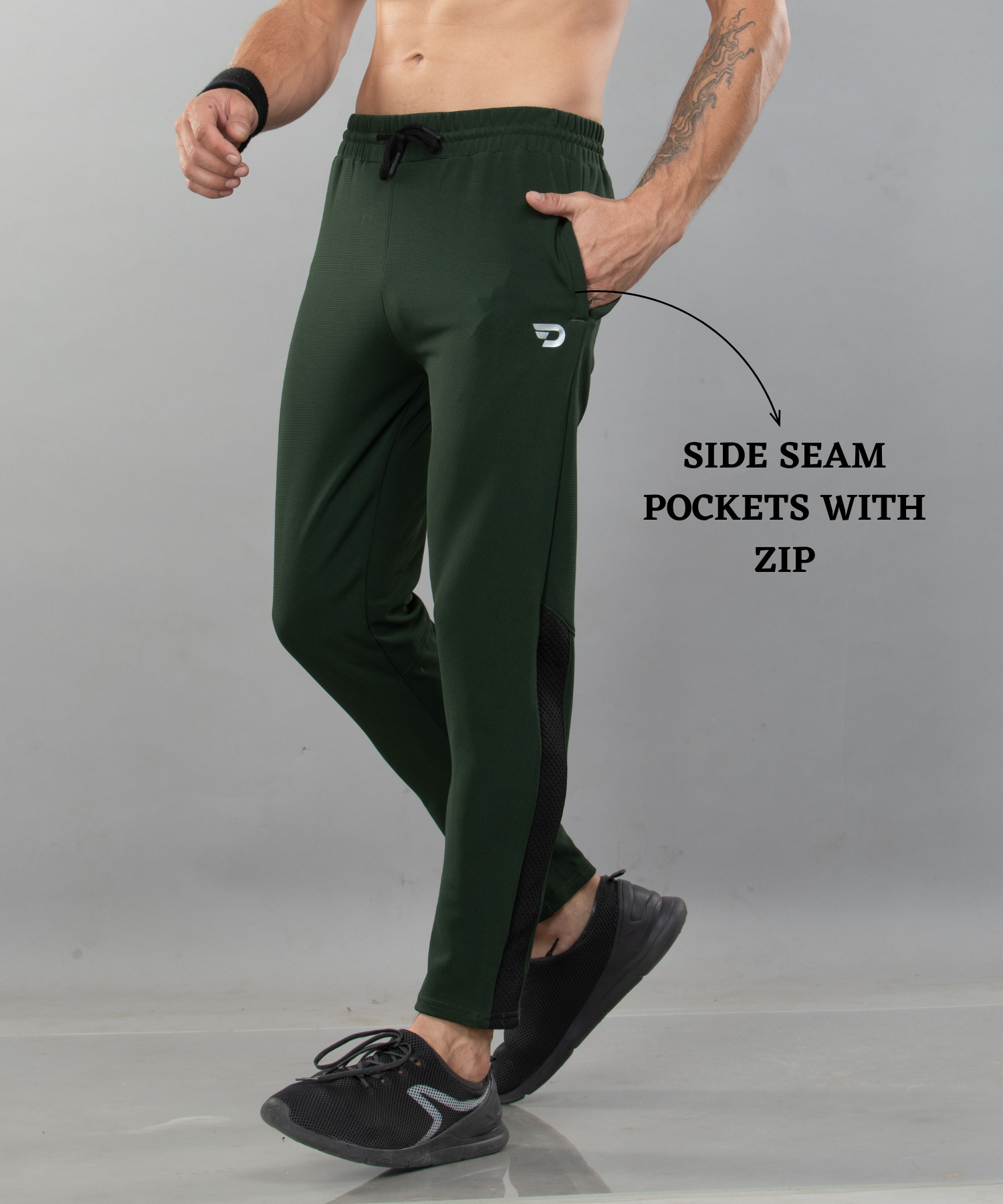 “D” logo printed on the left thigh