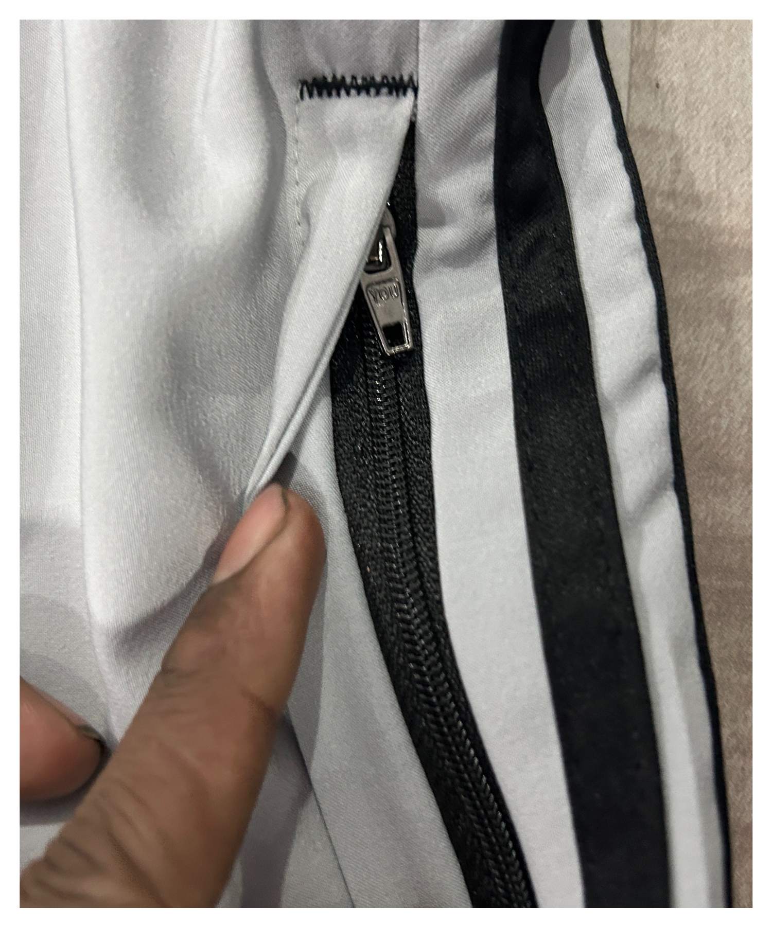 Half 3-strip design ,Pockets with Zip, Regular Hem